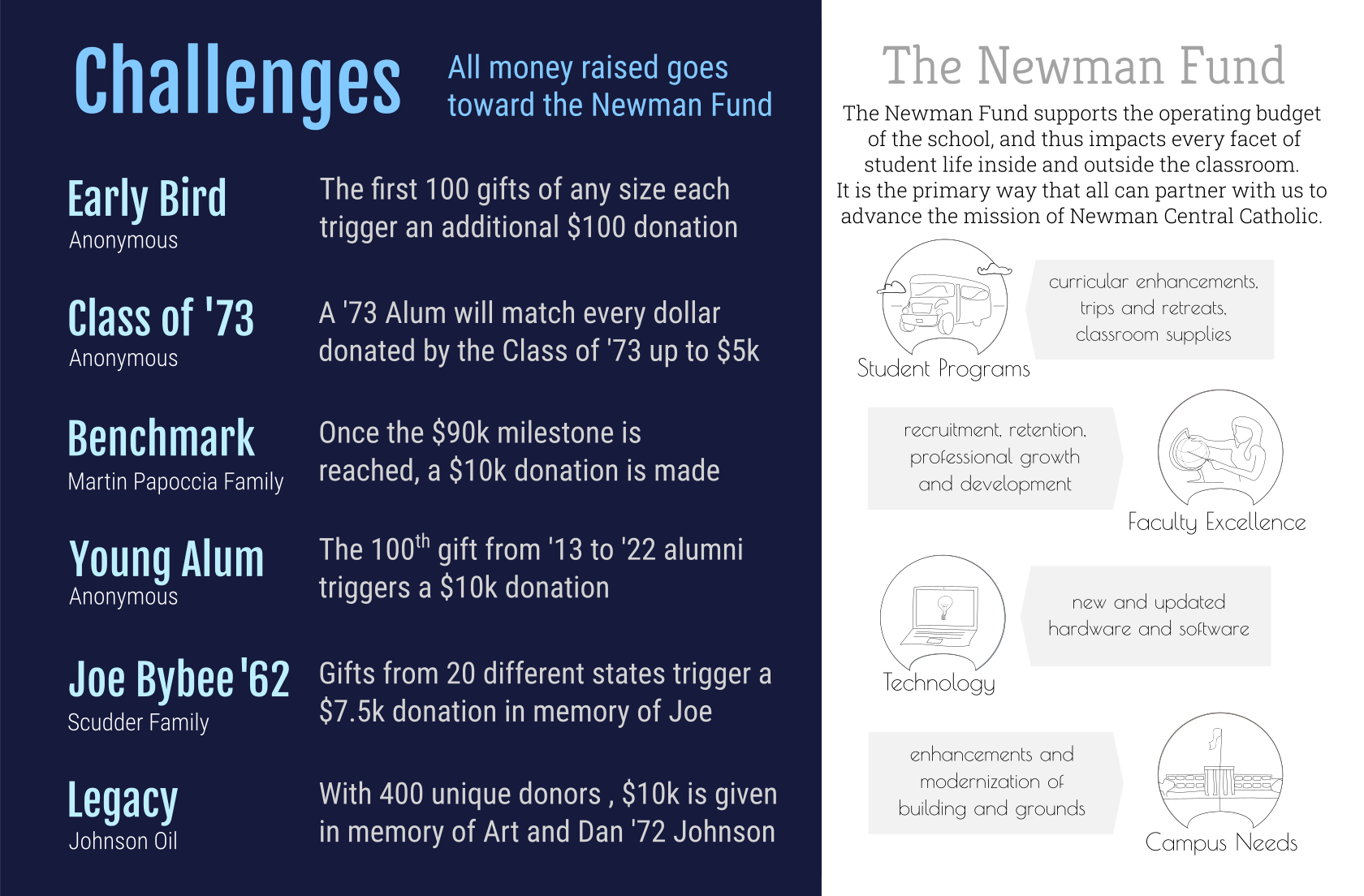 The operating budget has been branded "The Newman Fund" and we needed to explain what this fund does. When people see we raise a lot of money on the day of giving, they think "what are they going to buy with that money?"